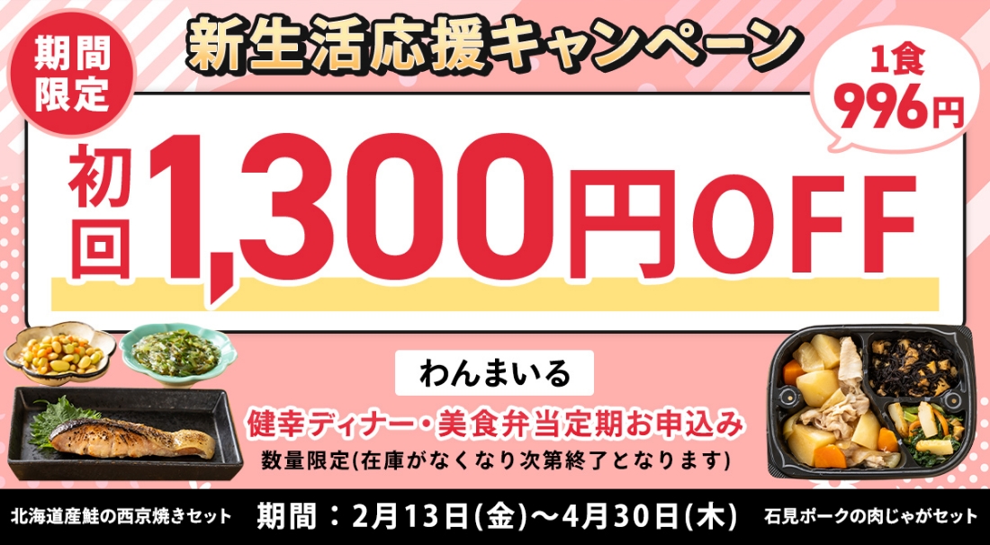初めて利用する方を対象に、健幸ディナー・美食弁当の定期コースが初回1,300円オフになります。