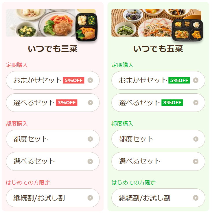「いつでも三菜(3品)」と「いつでも五菜(5品)」があり、それぞれ7~20食入りのセットで注文できます。